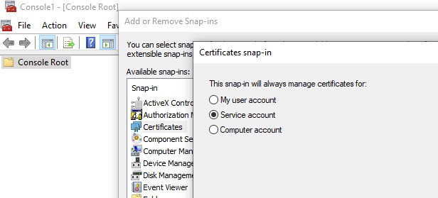 - Open mmc.exe and Add the Certificate snap-in and select “Service Account”.