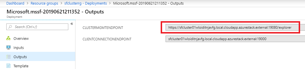 Once the deployment completes, you can view the output from the deployment to get the Service Fabric cluster management endpoint.