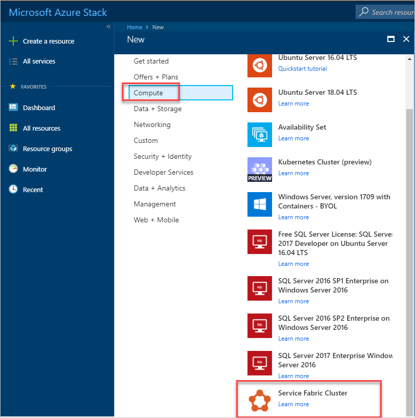 - In the user portal, go to + Create a resource > Compute > Service Fabric Cluster.