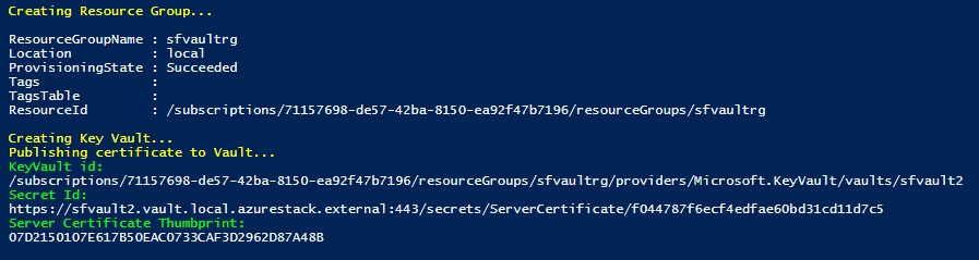 $Vault = New-AzureRmKeyVault -VaultName sfvault -ResourceGroupName $rgName -Location $location -EnabledForTemplateDeployment -EnabledForDeployment -EnabledForDiskEncryption
