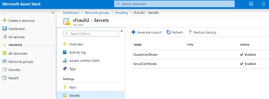New-SelfSignedCertificate -DnsName servicefabriccluster.local.azurestack.external -CertStoreLocation Cert:\LocalMachine\My\
